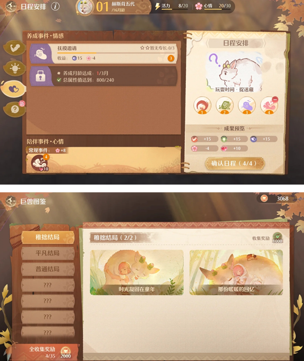 在《无限暖暖》2.1版本中,“巨兽成长日记”限时任务需培养4只巨兽以达成4种不同结局,从而解锁600粉钻等核心奖励。每种结局由巨兽在16月龄养成结束时的总属性值与各属性评级决定。以下是快速达成四种结局的养成攻略: