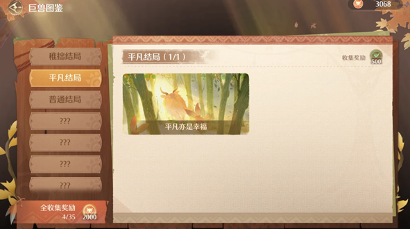 3、第三只巨兽,完成结局【平凡亦是幸福】,达成条件总值>1996,且没有A和S。
