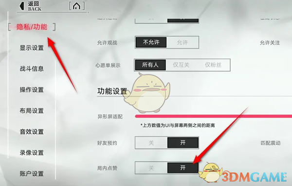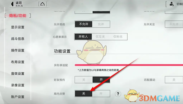 答:在隐私功能中找到局内点赞,点击开启或者关闭选项进行设置即可。