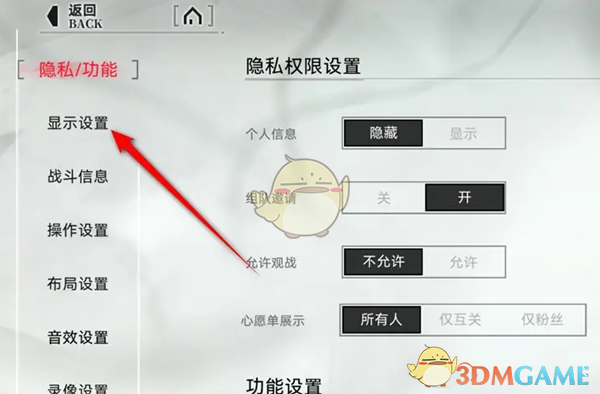 2、然后在游戏设置菜单栏内,点击左侧的显示设置功能;
