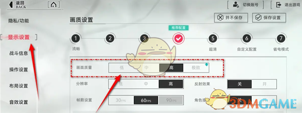 答:游戏设置-显示设置-画质设置-按需设置即可。