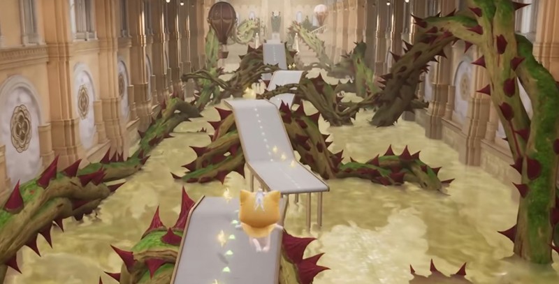 后半段路程是通关的难点所在。当顺着卸妆水流来到荆棘丛生的路段时,玩家需要操控大喵小心避开这些荆棘,同时注意不要掉落到水中。触碰荆棘会扣除暖暖一格生命值,而落水则会直接导致任务失败并返回路段起点。通过这段危险区域的最佳方法是熟练运用二段跳技巧,让大喵在第一次跳跃达到最高点时再进行第二次跳跃,这样可以越过大部分荆棘障碍。对于少数无法直接越过的荆棘,可以采用几何跳的方法,先向旁边跳出传送带范围,越过荆棘后再通过二段跳调整角度回到传送带上。