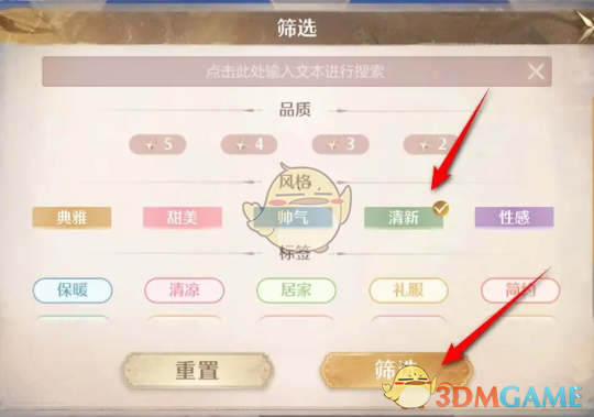 4、在筛选页面点击清新标签,之后在右下角点击筛选,根据筛选结果完成清新套装的搭配。