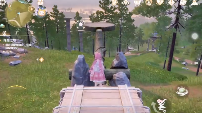 玩家如果想要获得在高处的物品,可以先来到跷跷板处,站在跷跷板的中心位置。此时玩家就需要按住跳跃键,跷跷板就会迅速的下降,与此同时角色就会高高的飞起。