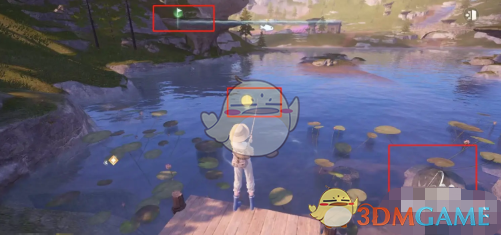 2、抵达后即可在水边寻找鱼儿游动的位置,点击右下角的抛竿动作。