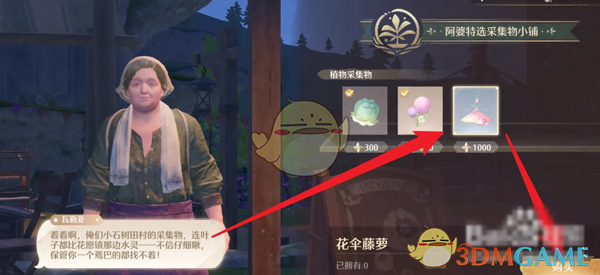 3、进入阿婆特选采集物小铺,找到花伞藤萝点击购买;