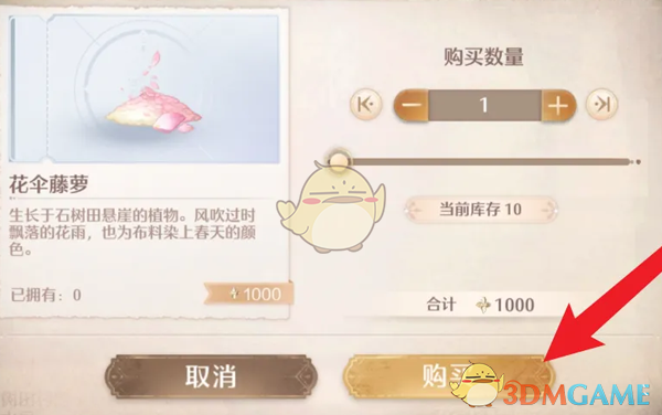 4、选择购买数量后,使用噗灵就可以购买到花伞藤萝了。