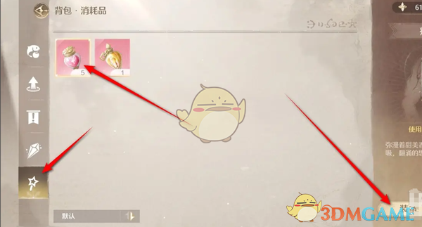 3、在背包页面点击左侧的星星,找到消耗品选择花露点击装备;