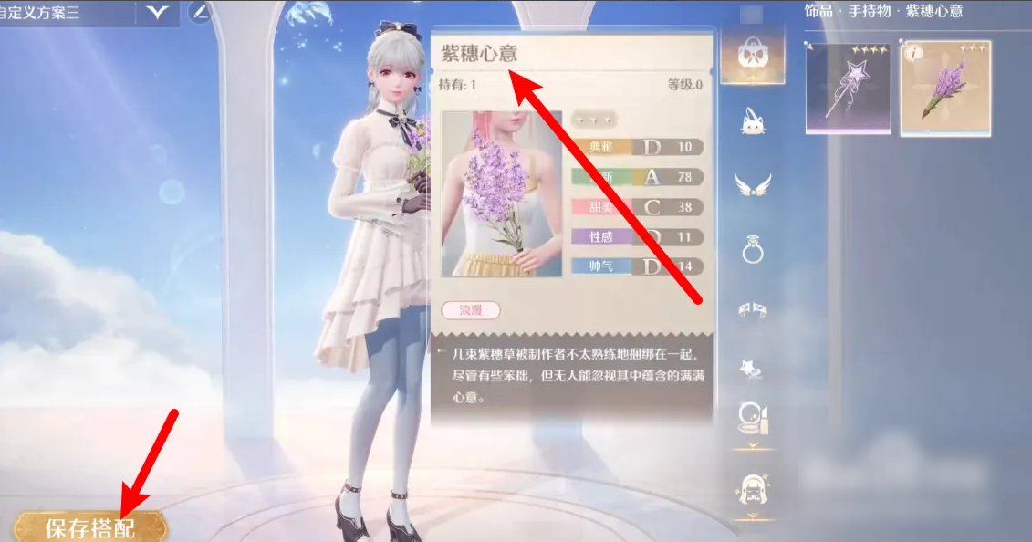 3、进入换装界面,找到紫穗心意花束,点击保存搭配即可。