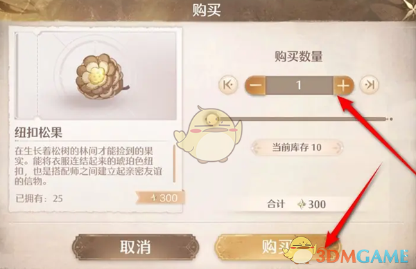 4、一个松果售价300噗灵,选择购买数量后点击进行购买;