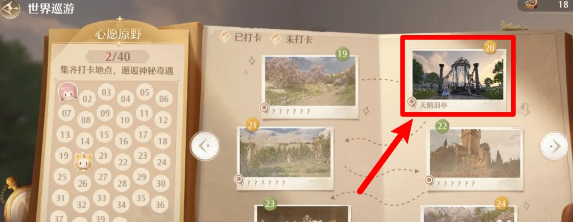 无限暖暖世界巡游20号拍照打卡点在哪?世界巡游一共有40个地点需要拍照打卡,其中二十号拍照打卡点在天鹅羽亭,下面是小编给大家带来的《无限暖暖》世界巡游20号拍照打卡点位置,感兴趣的小伙伴们一起来看看吧。