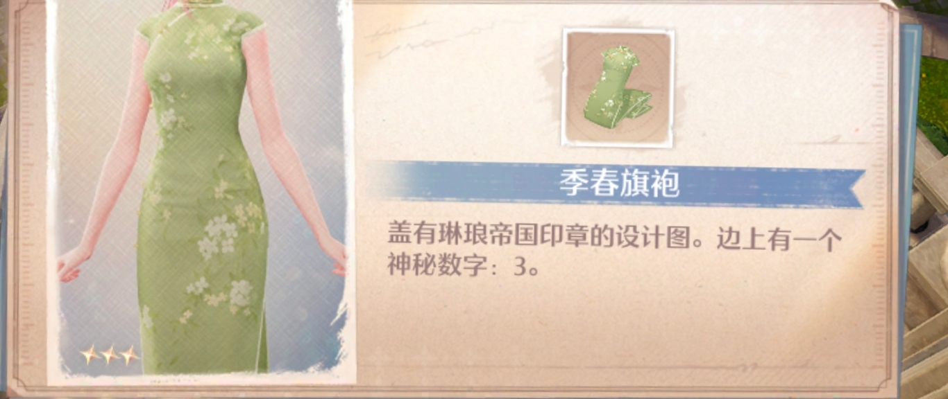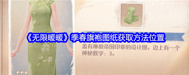 无限暖暖季春旗袍图纸在哪获得?这是一件非常有气质的绿色旗袍,上面盖有琳琅帝国印章的设计图并且在边上还有一个神秘数字3,可通过开启宝箱的方式解锁,下面给大家带来了具体的季春旗袍图纸获取方法位置,不清楚的一起看看吧!