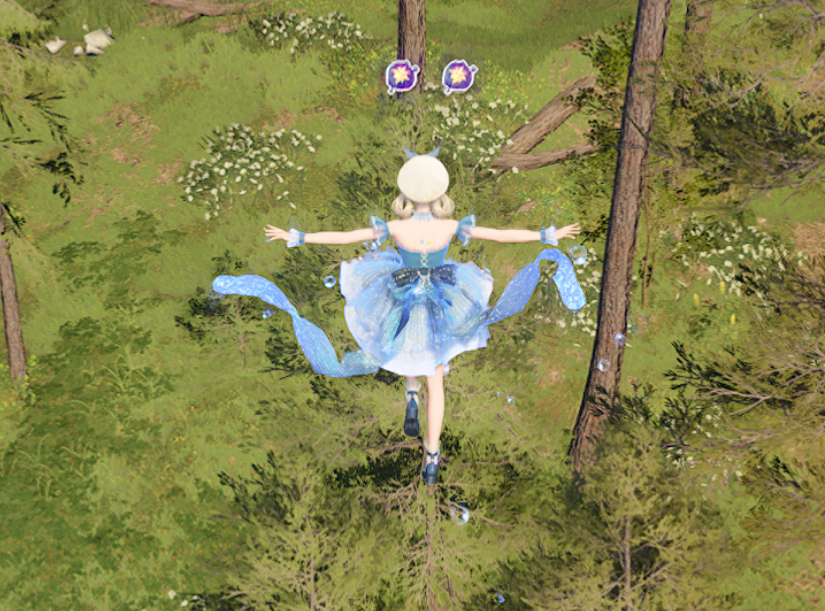 拿完后别急着离开,稍稍走向西南方向,这里有一棵弹力叶子树,跳上去,树上的露珠也会乖乖到手。沿着北偏西方向走,别被怪物镇守的宝箱吓到,打败它们后记得打开宝箱。附近还有一个跷跷板的机关,巧妙利用下坠攻击弹起跷跷板,空中能看到两颗露珠。回到跷跷板上,再次飞跃,这次转向北方,又能得到两颗露珠。
