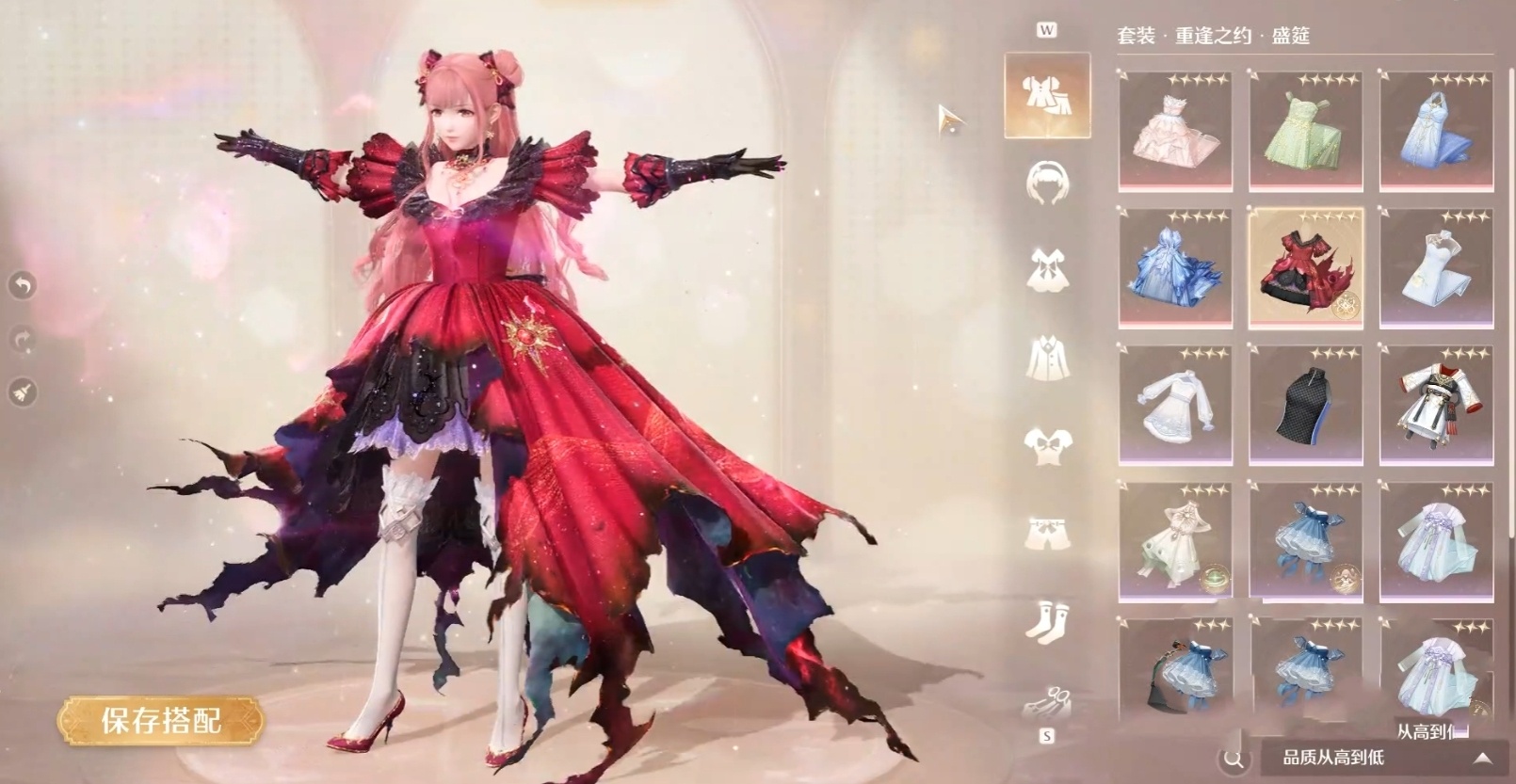 重逢之约·盛宴是最早能接触到的五星套装之一。这套装以浓郁的红色为主调,华丽的长裙搭配缀满金丝的细节,像一场盛大的宴会专属礼服,能够完美展现角色的自信与张扬。这套装的获取相对友好,只需完成主线任务即可解锁,非常适合新手玩家作为第一套五星收藏。不仅设计亮眼,获得方式也颇具仪式感,让人感受到剧情与成长的双重满足。