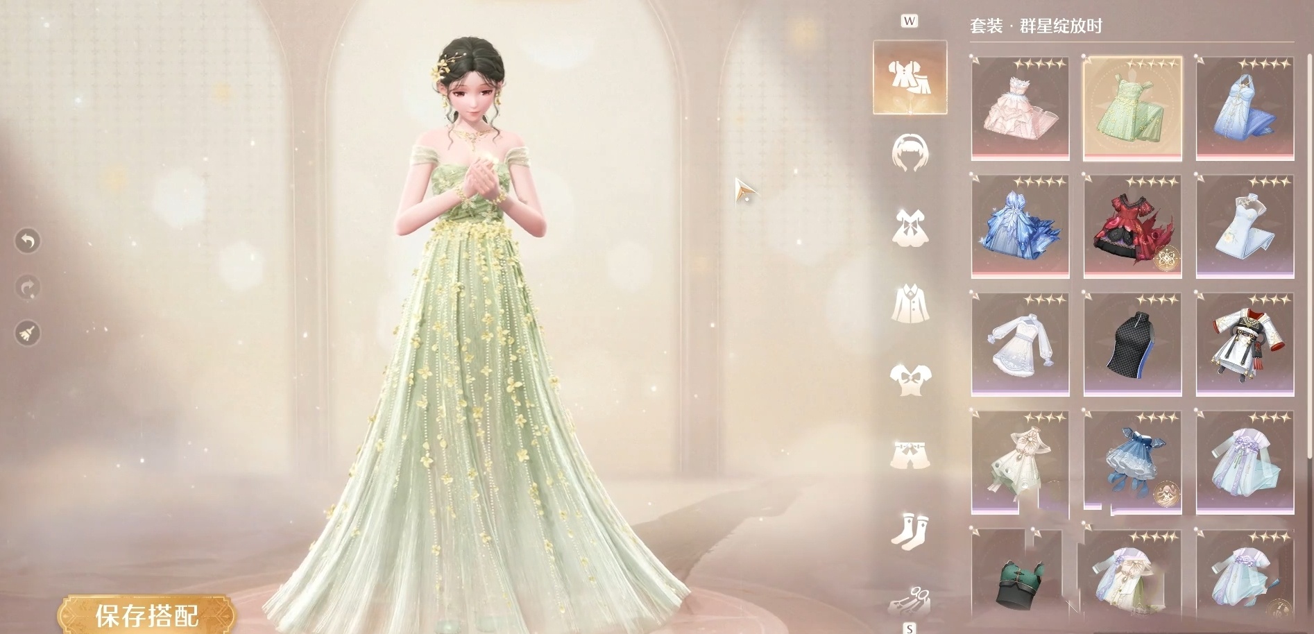 接着是群星绽放时,这套服饰充满了春日的清新气息,整体以绿色为主,裙摆间点缀着星光特效,随着角色的转动会闪烁出淡淡的光芒。这套装不仅视觉效果细腻,还带着一种自然的律动感,仿佛置身于满是绿意的星空之下。它的获取方式也比较特别,只有在提前预约活动中才能解锁。对于那些错过预约的玩家来说,这套衣服可能会成为一份“遗憾之美”。