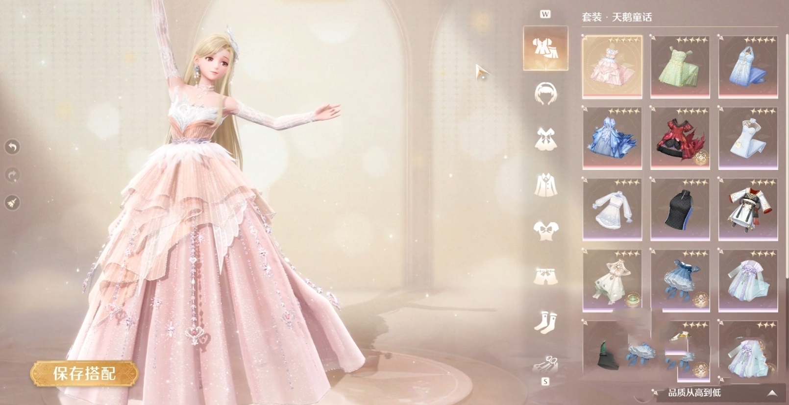 最后不得不提的是天鹅童话,这套完全就是为公主梦而生。从头饰到裙摆,繁复的设计无一不在彰显华丽感,整体以白色和粉色为基调,配上羽毛状的细节和闪光点缀,完全就是童话中的天鹅公主再现。获取方式还是通过惊喜滚滚机,抽到它的概率并不高,但正因如此,它也成了许多玩家的梦寐以求之物。部分单品还能通过商城购买,虽然凑齐整套需要一定时间,但完成后的满足感绝对值得期待。