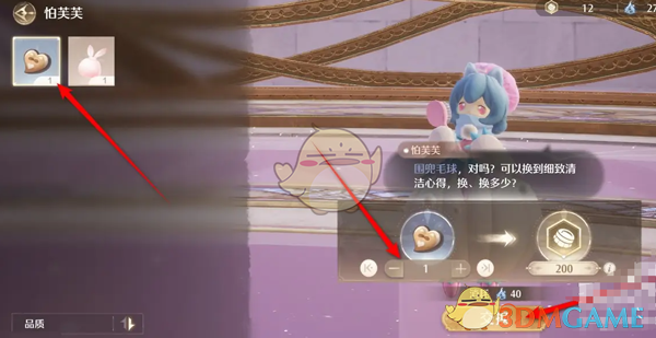 4、最后设置交换数量,选择围兜毛球和货币,点击交换即可获得心得。