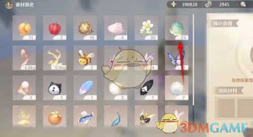 3、在素材激化台的右侧选择噗灵,再选择一种素材,设置放入数量,点击确认。