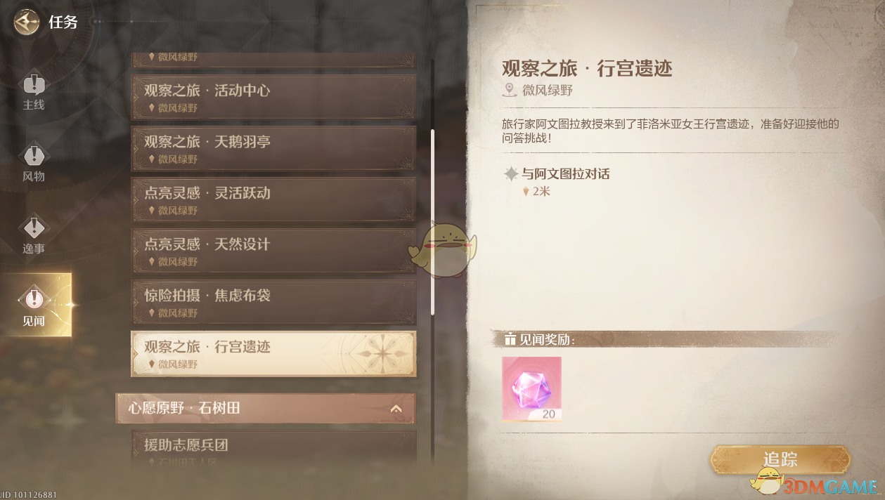 二、见闻解锁方式:打开地图先传送到地图中最近的流转之柱,随后朝箭头点位走