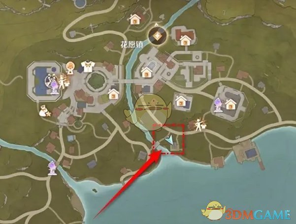1、首先我们打开地图,传送到花愿镇的小房子上方;