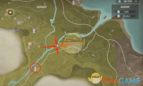 2、根据箭头指示方向点位前进,在河流的边上即可找到浮絮巨鸥巢,点位参考如下。