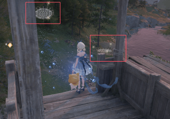 2、到达位置后,玩家可以看到一座小型木质哨塔,使用图中标记的两个蹦床就可以跳上来。