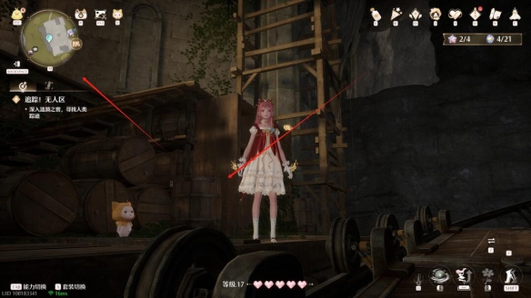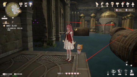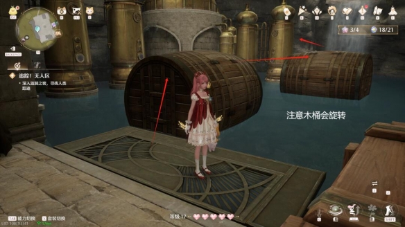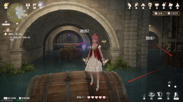 路线①:向右侧一排木桶跳跃,门洞下拿取灵感露珠。