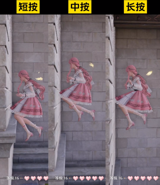 游戏里角色跳高跳远的方法就是长按跳跃键,长按跳跃键的跳跃高度几乎是短按跳跃键的一倍,另外方向键+长按跳跃键也能跳的更远。