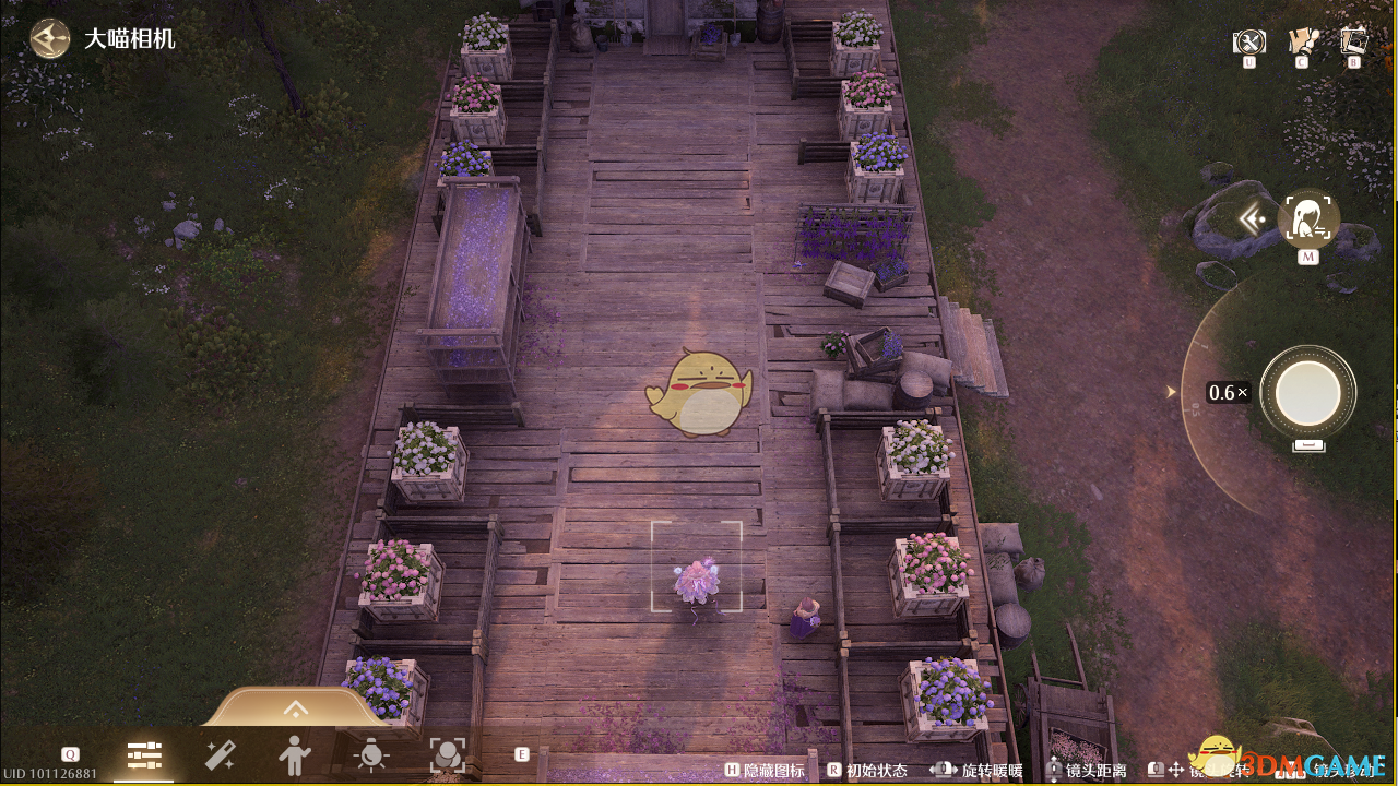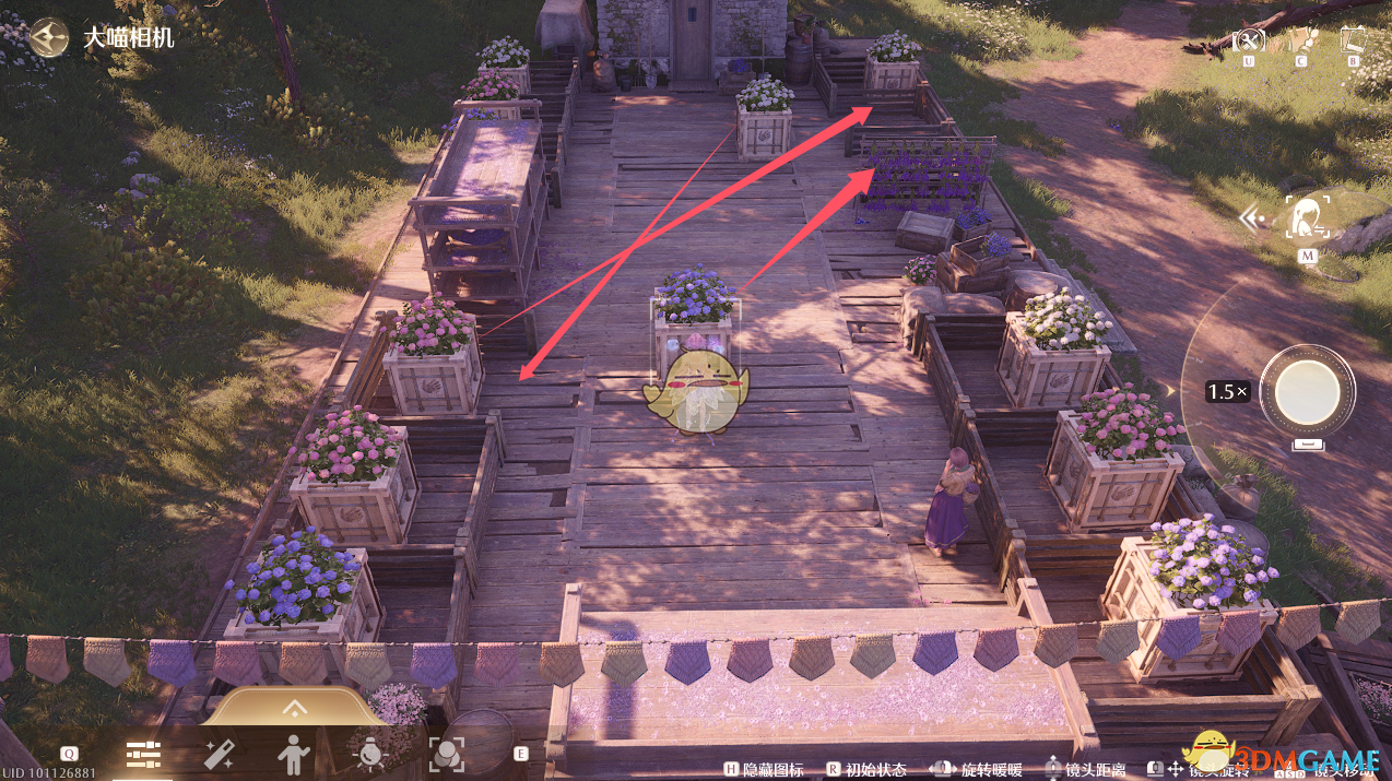 3、将图中角色前方的紫色花箱移动到右上角第二个空位,接着走到图中角色左边把粉色花箱移动到右上角第一个空位。