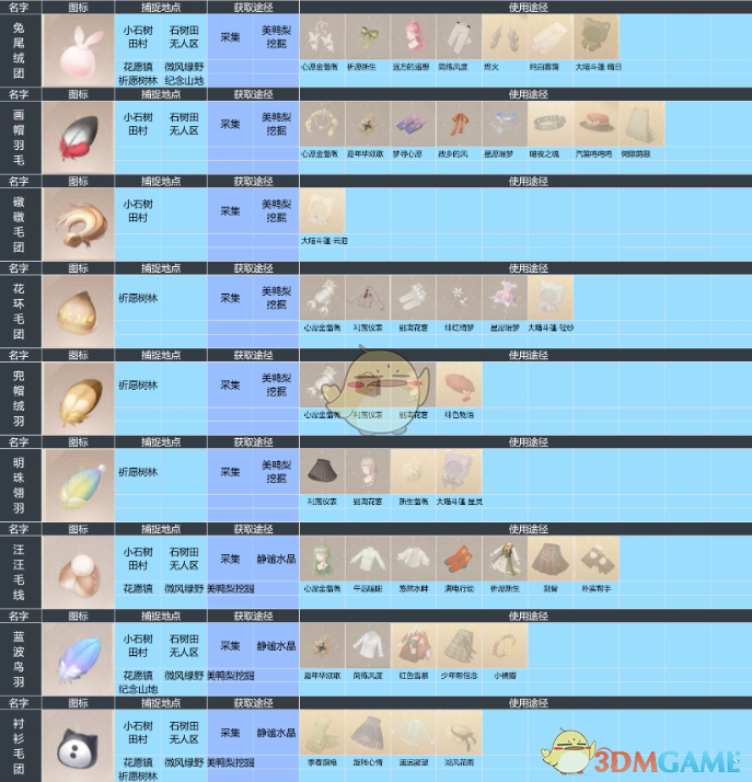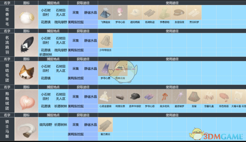 捕捉地点:小石树田村、石树田无人区、花愿镇、微风绿野、祈愿树林