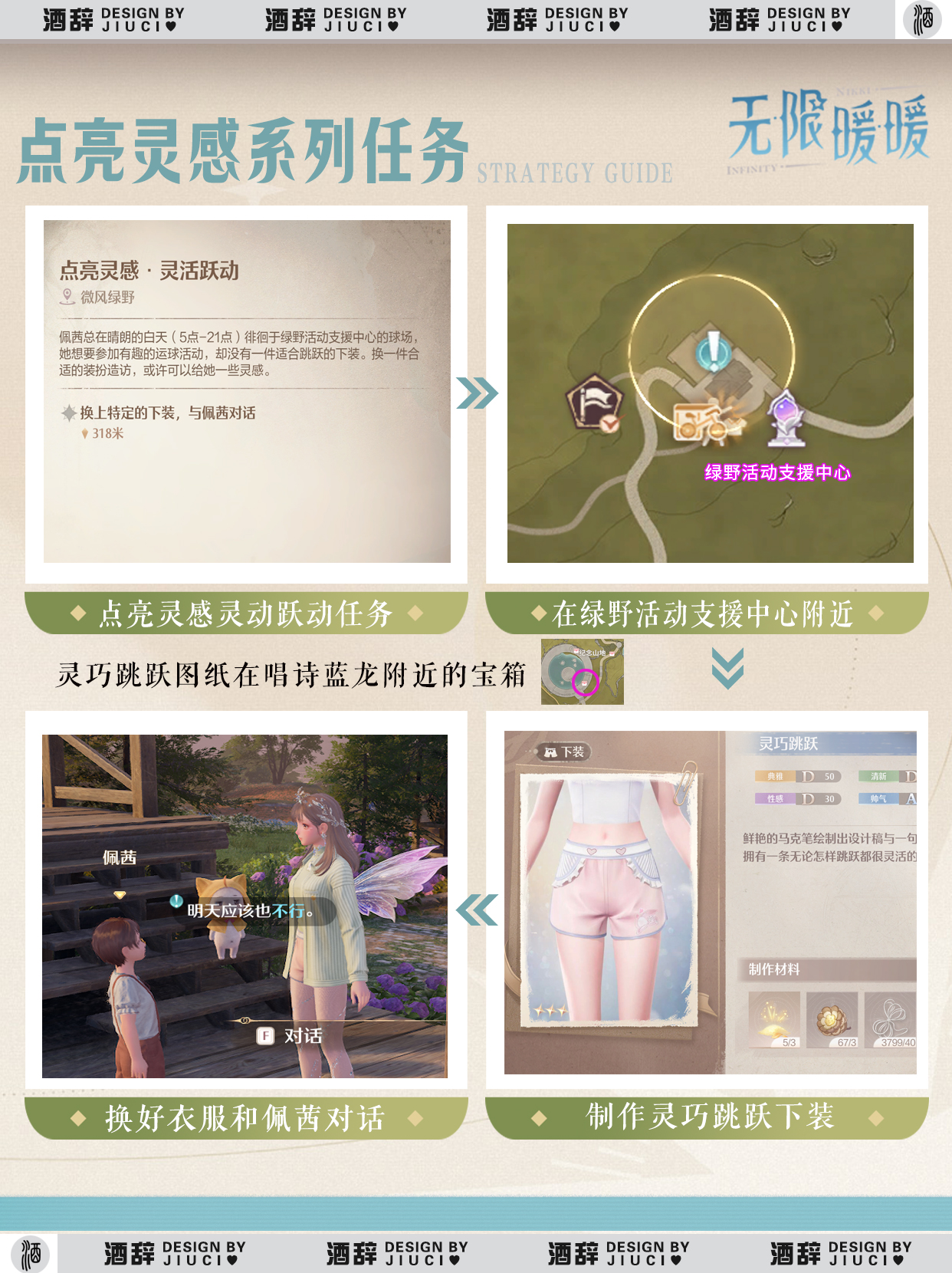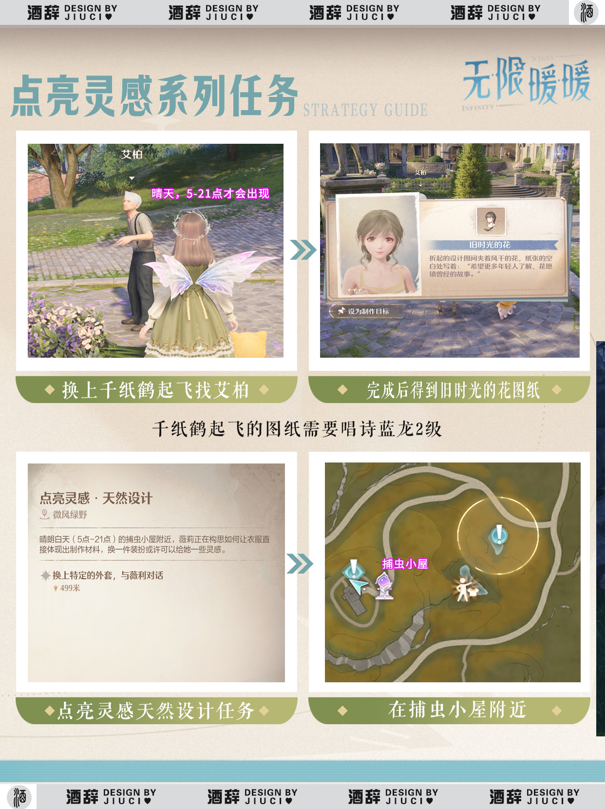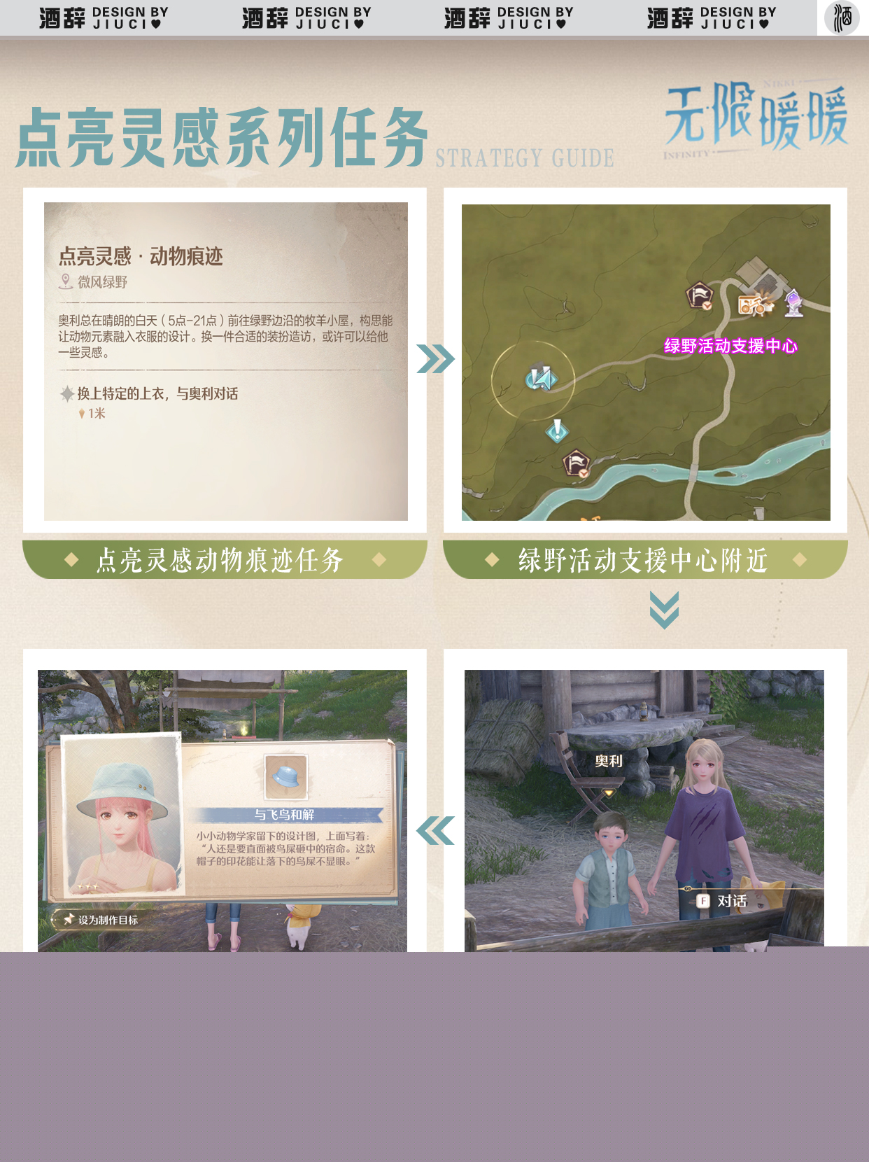 无限暖暖点亮灵感攻略大全!无限暖暖游戏中点亮灵感系统有多个任务,分别是:点亮灵感-伪装色、点亮灵感-天然设计、点亮灵感-旧日的她、点亮灵感-灵活跃动、点亮灵感-好运随行、点亮灵感-温暖守护、点亮灵感-动物痕迹、点亮灵感-花间轻行等。下面给大家带来了《无限暖暖》8个点亮灵感系列任务攻略!
