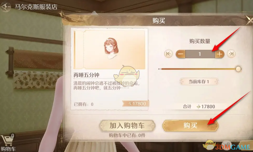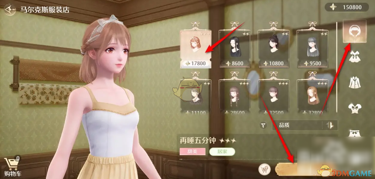 3、点选发型页面,点击选中“再睡五分钟”发型,点击“购买”。