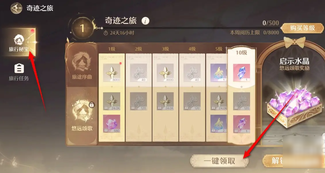 3、即可一键领取到所有当前可领取的旅行秘宝物品了。