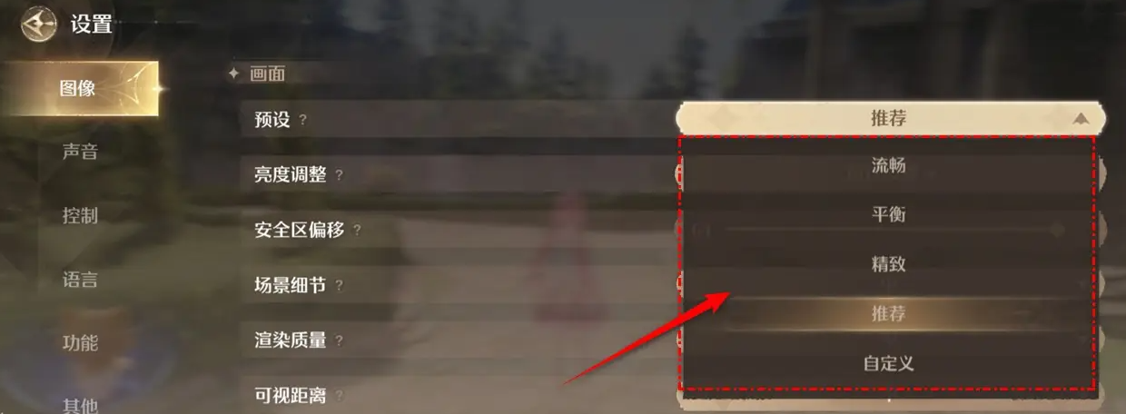 3、点选即可设置图像质量为“流畅”、“平衡”、“精致”、“推荐”或“自定义”了。
