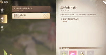 1、点击任务界面左侧的【世界】按钮,然后点击追踪支线任务-露珠与山中之诗并完成。