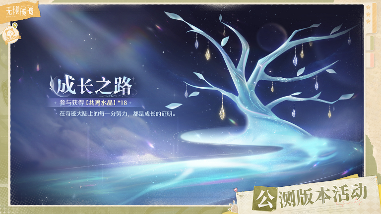 限时活动「成长之路」开启。活动期间,搭配师完成「朝夕心愿」每日任务,累计心愿之辉,达到目标数量可获得18*「共鸣水晶」。
