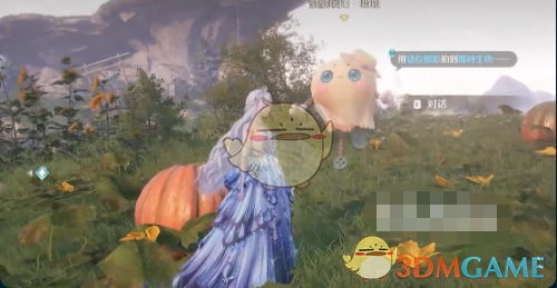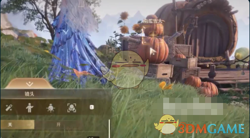 4、靠近后和晒晒对话,启动拍照模式,镜头对准小屋左侧的两个南瓜,调整视角,升降机位。