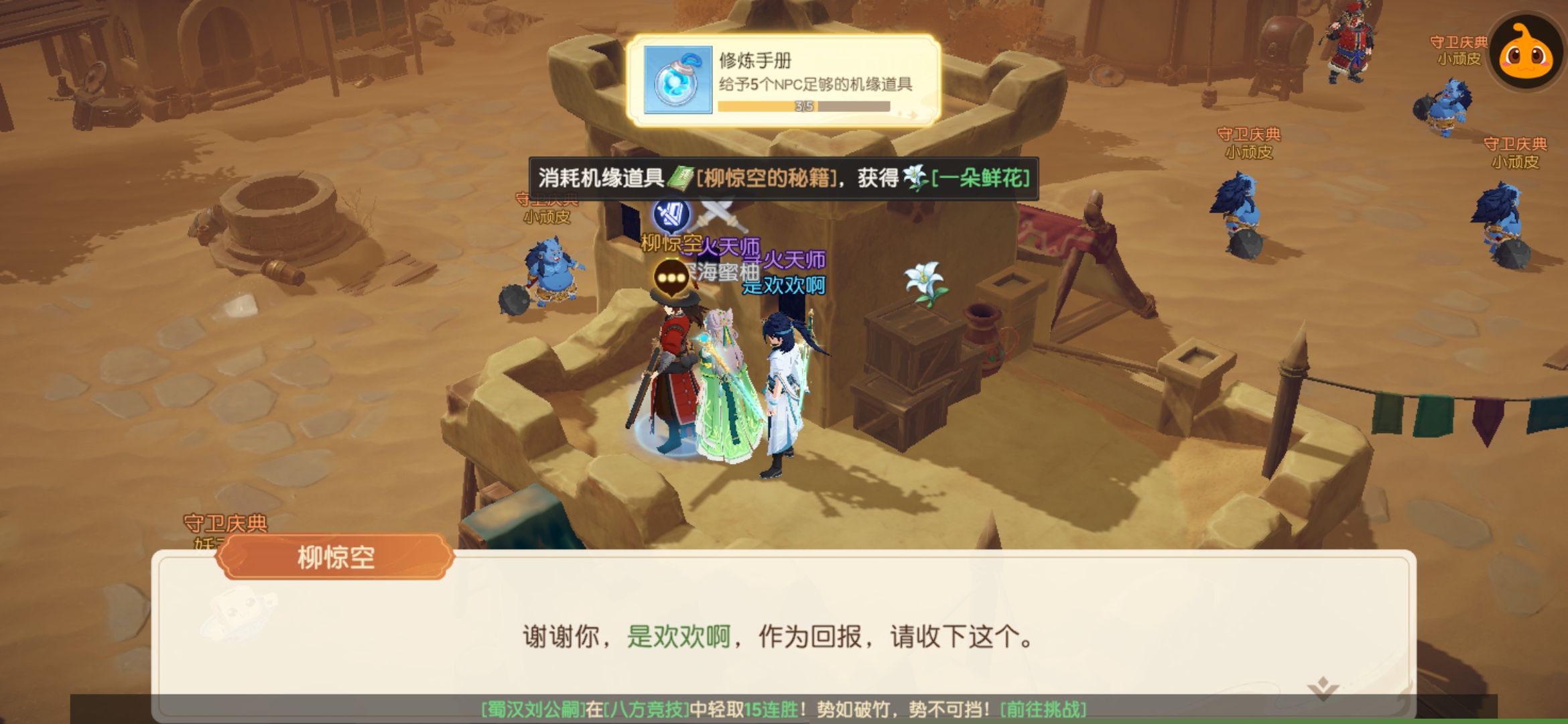 第三个,捡到柳惊空的秘籍后,来到西大漠,交还给他,奖励鲜花一朵,毕竟抠门哈。