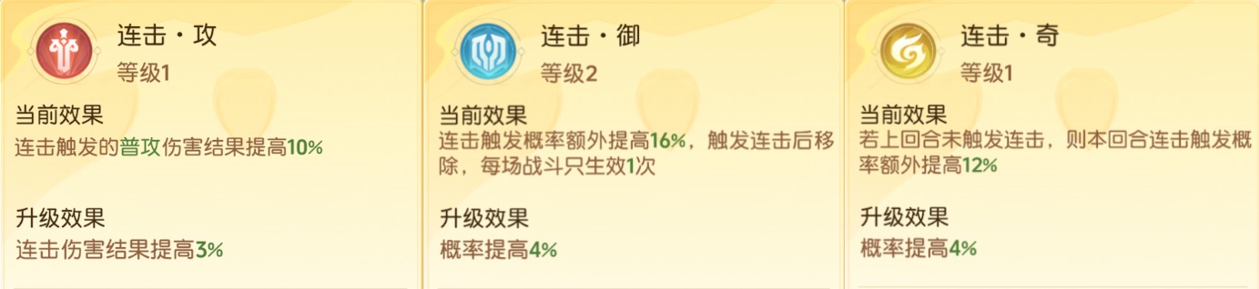 2、连击·御:连击触发概率额外提升24%,每场战斗只生效1次。有点鸡肋,不建议选择。
