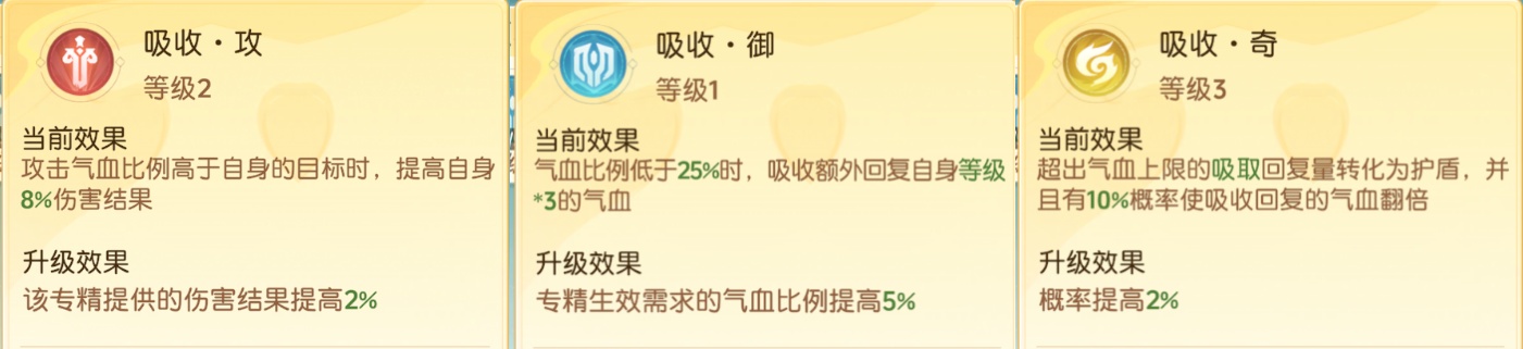 2、吸收·御:气血比例低于25%时,吸收额外回复自身等级倍数的气血。专精触发条件苛刻,不建议选择。