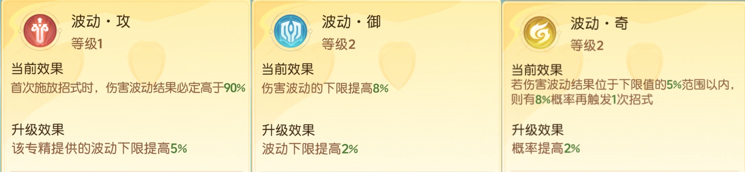 1、波动·攻:首次释放招式时,伤害波动结果必定高于105%。只有一次效果,感觉意义不大,不建议。
