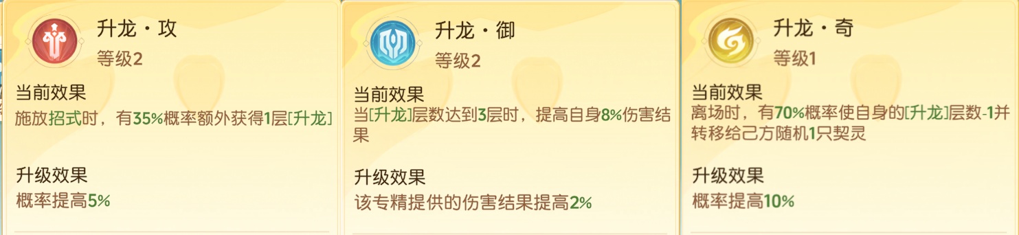 2、升龙·御:放升龙层数达到3层时,提高自身12伤害结果。站场契灵的选择,升龙专精的首选。