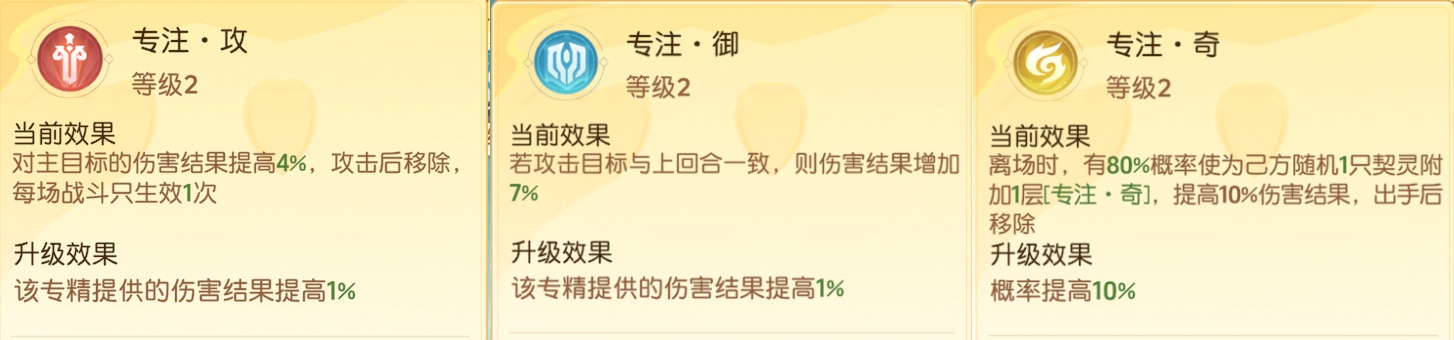 3、专注·奇:离场时,有100%概率转移给已方随机1只契灵一层专注奇,提高10%的伤害结果。随机性导致可能给辅助契灵,不建议选择。