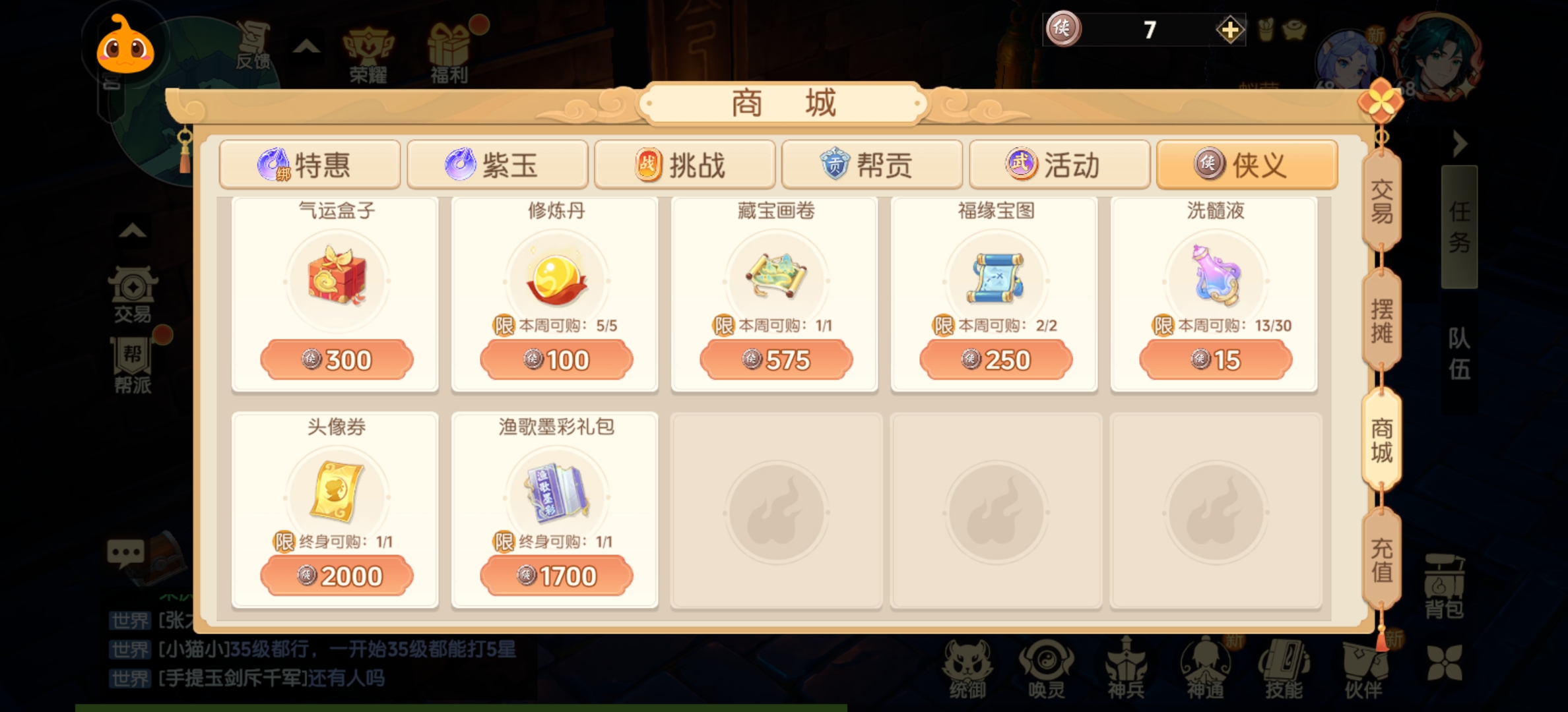 2、侠义商城主要有气云盒子、宝图、伙伴礼盒等,红色伙伴礼盒可以优先换取,宝图每周一个,其他侠义建议都用来买气运盒子,提升技能等级。
