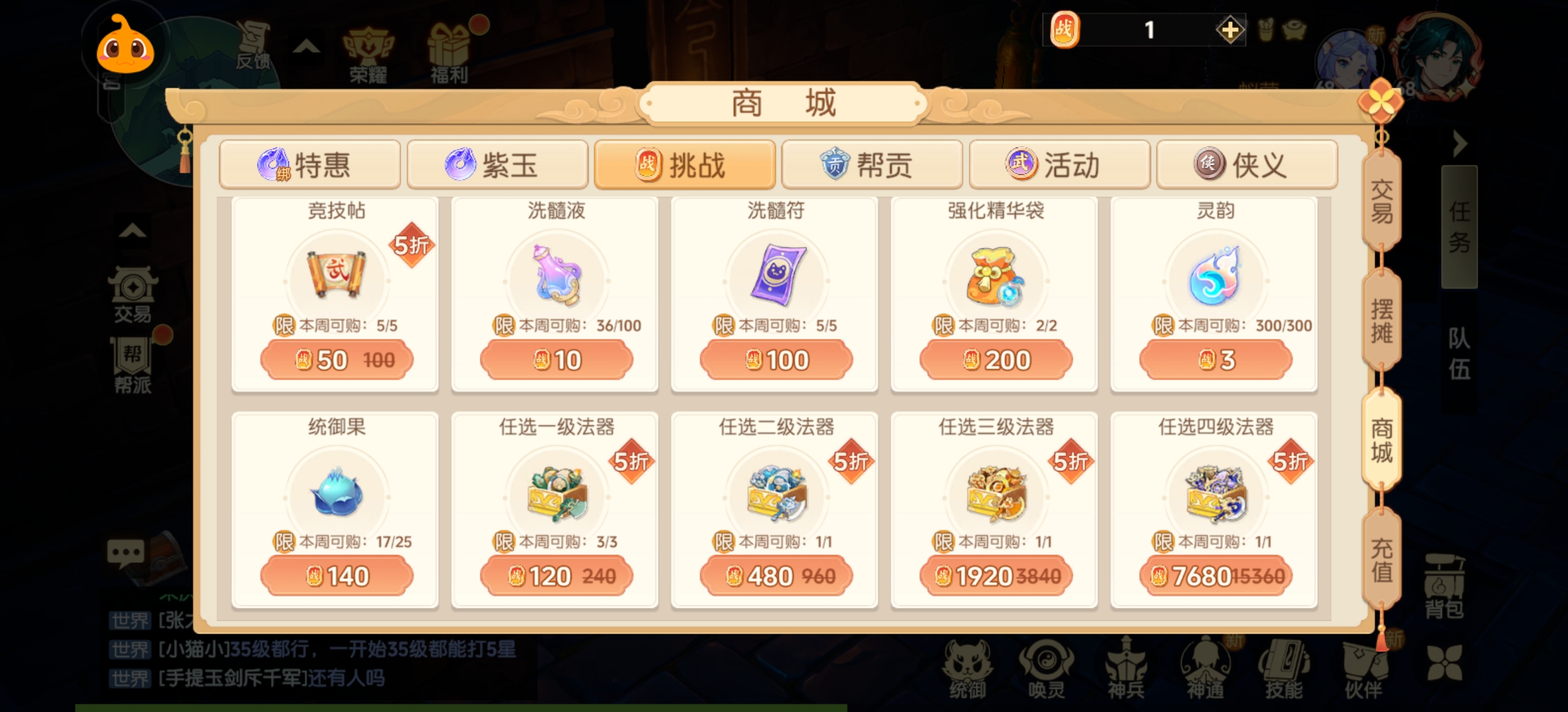 2、挑战商城中最值钱也是最值得换取是神兽内丹,需要16000币,需要耐住寂寞才能买到平民玩家获得内丹的途径之一。竞技帖每周五个建议买完,其他物品可以等到神兽内丹买后再酌情购买。
