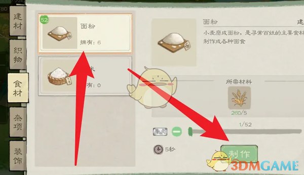 2、接着在制作页面,点击左侧的食材,选择面粉消耗小麦进行制作;