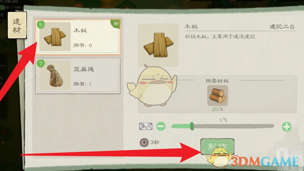 2、然后点击建材,选择木板进行制作,消耗木头点击右下角的制作即可获得木板。