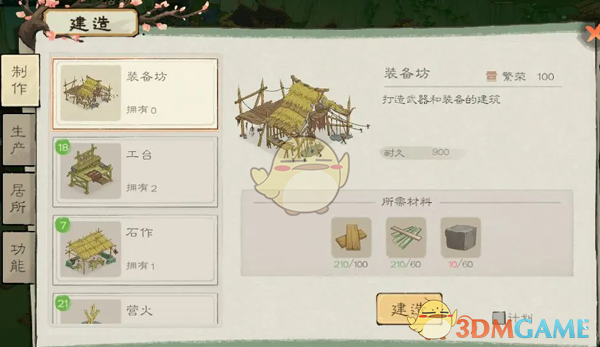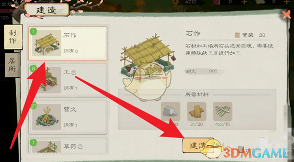 答:在建造页面找到石作,消耗竹子、木板、石头即可完成石作的制作。