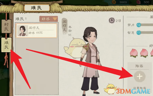 答:游戏主页-村民-难民-陪客,选择村民即可设置陪客村民。
