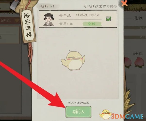 3、最后在陪客选择页面,选择陪客的村民后点击下方的确认即可完成设置。